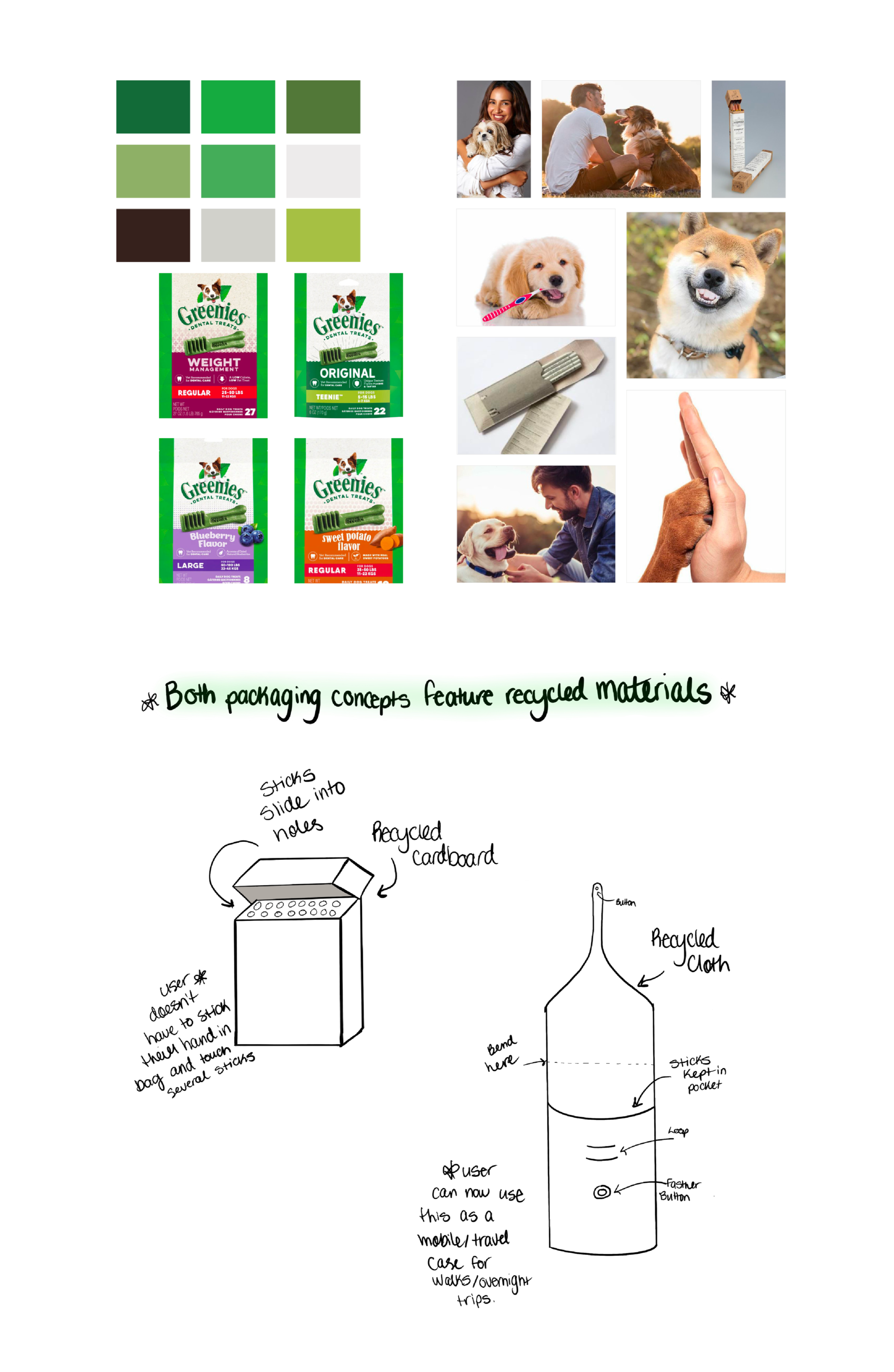 The research portion of this project was very in depth — at times requiring me to physically visit a few different pet stores that would regularly stock Greenies. The research portion encapsulates client research, consumer research, moodboards, as well as rough concept sketches for the dieline. Since Greenies itself is already a highly established brand, I really wanted to dive deep into their brand, tone, values, etc. to ensure I replicate that in the most effective ways.