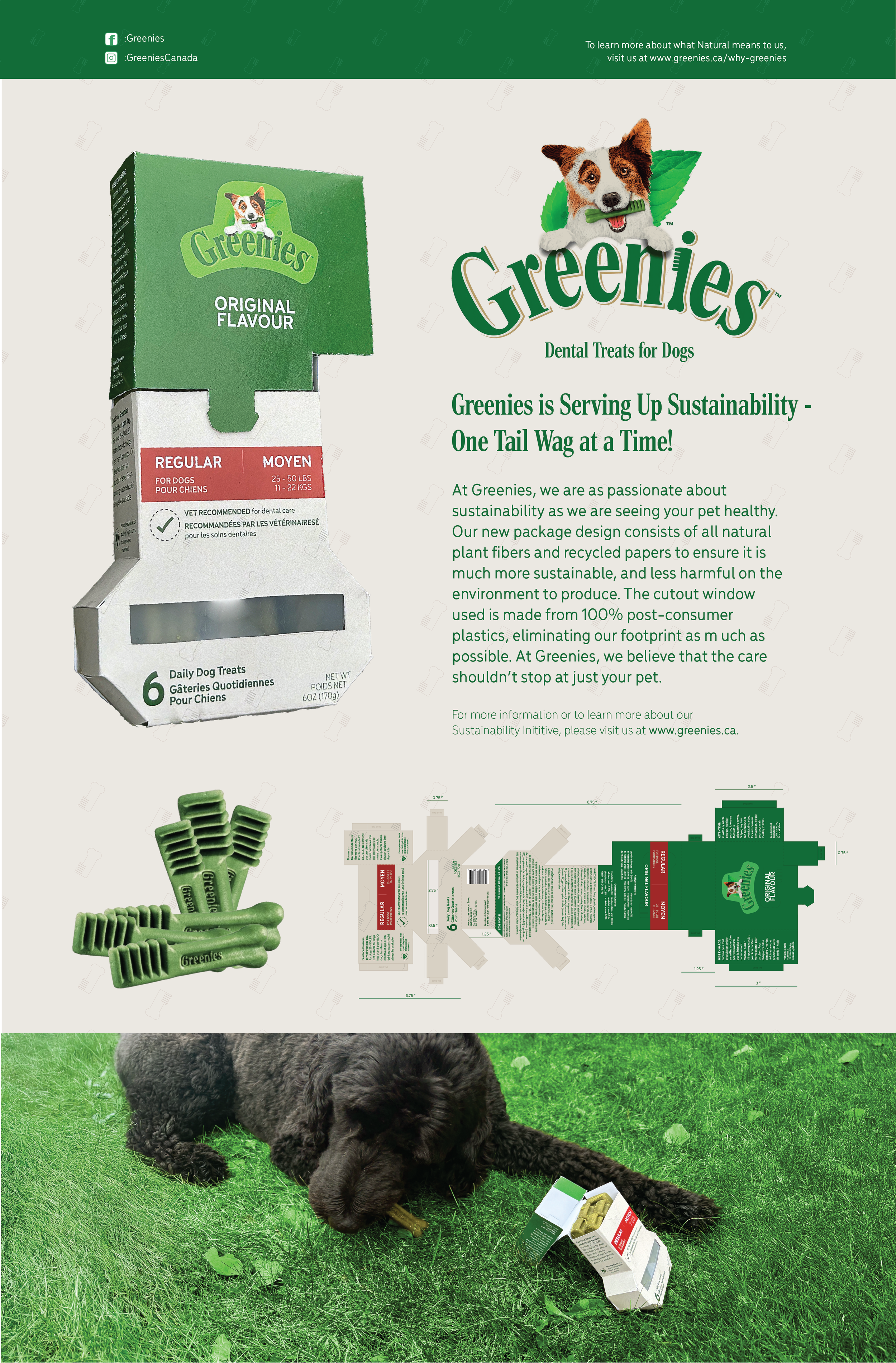 This is evident with the catchy, evoking typeface used and the patterned background created from the shape of Greenies dental treats. The package redesign is also paired with an advertisement poster, showcasing the product in use alongside the package.
