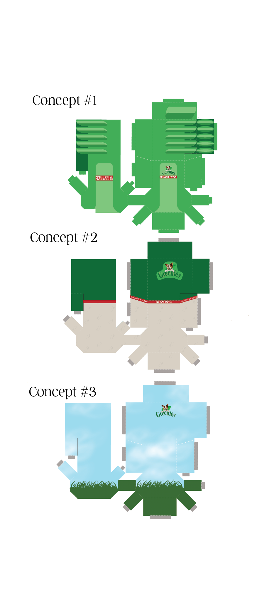 The ideation phase of this project consisted of rough concept sketches, brainstorming/mindmapping, dieline wireframes, as well as rough concept development. I was quite drawn towards a dieline concept where the physical packaging replicated the shape of the Greenie’s dental treats themselves, and decided to really take that and run with it as far as I could go (keeping in mind,